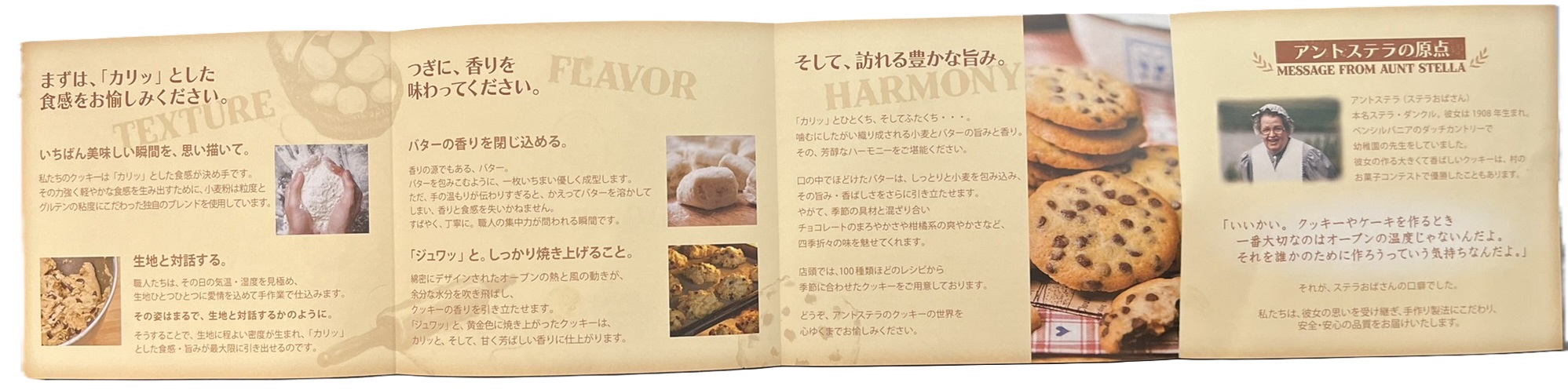 Egy hosszú papír csíklap, precízen a doboz keksz-fakkjának méretére vágva és hajtogatva szöveges illusztrált fényképekkel mutatja be a cég egyéb termékeit, a vállalat filozófiáját, rövid történetét és még a névadó Stella nagynéni sztorijára is szorítanak helyet. Minden aprólékosan megtervezett és kivitelezett. A színek, a szöveg, az illusztráció, a fontok és az információ átadásának a sorrendje. A vásárló nem tévelyeg el a felkínált kekszek bőségében, a felbontásra kiválasztott kekszhez mielőtt hozzáérne szép sorjában aprólékosan megkapja az információt a legmegfelelőbb döntéshez.