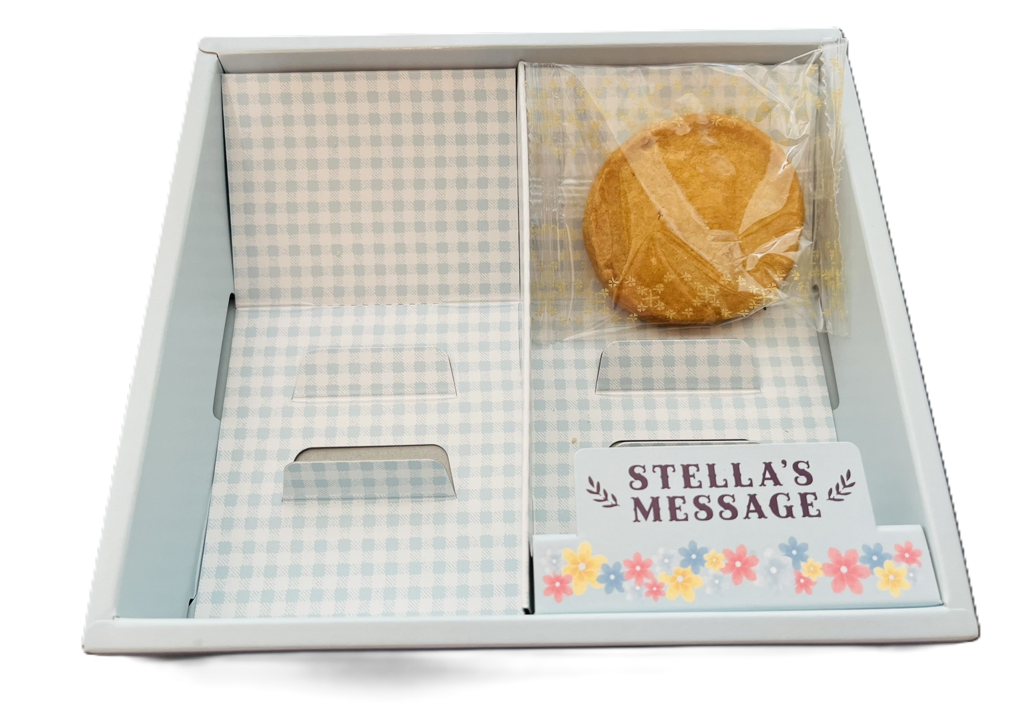 A kartondobozban a csomagolt kekszek (Japánban a magas páratartalom miatt a hosszabb eltarthatóság érdekében szinte minden élelmiszer darabonként celofánba van csomagolva) döntve olyan szögben sorakoznak, hogy jól kivehető legyen a színük és a formájuk. A doboz jobb alsó részén kartonpapírból kialakított fülecskén olvasható nagy betűkkel, party meghívóra használt fonttal nyomtatva: „Stella üzenete”.
