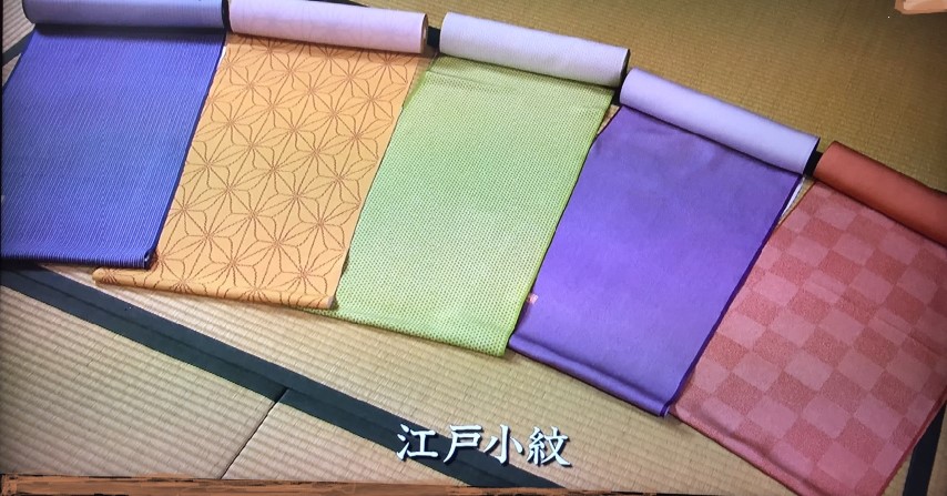 Érdemes talán a kor kimono mintáiról is pár szót szólni. A gazdasági megszorítások miatt betiltották a feltűnő, pazar mintákat. Viszont megvolt az igény arra, mint mindig általában, főleg a nők körében, hogy valamilyen módon kifejezésre juttassák egyéniségüket, hangsúlyozhassák fiatalságukat. Az Edo-komon, vagyis az edo-kori régi nyomott kimonominták nagyon rafináltan oldották fel ezt a feszültséget. Első látásra ugyanis egyszerű, szerény mintázatnak látszanak, ha azonban közelről, aprólékosan megszemléljük őket, akkor látszik, hogy mennyire alapos a kidolgozás és minél hosszabban nézzük az egészet, egyszer csak kivillan a beleszőtt rejtett minta, ami a luxust hordozta a viselője számára.